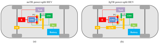 The second layout is depicted in Figure 1b and includes an additional 3-gear transmission (3gTR) installed between the output of the planetary gear set and the final drive. The latter solution can in fact provide additional degrees of freedom to the electric machine connected to the ring of the planetary gear set (EM1 in Figure 1).