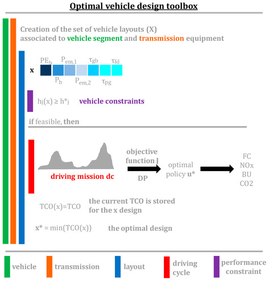 The tool used in the present work has been developed starting from a version presented in [26,35]. It generates many different design candidates for each vehicle layout. A screening procedure selects the feasible designs that meet the performance and emission constraints. The optimal control strategy is then identified for each feasible design using the DP algorithm. The candidate that leads to the minimum total cost of ownership (TCO) is hence selected as optimal. The toolbox is presented in detail in Section 4.1, the vehicle performance/emission constraints are reported in Section 4.2 and the cost definition is presented in Section 4.3.