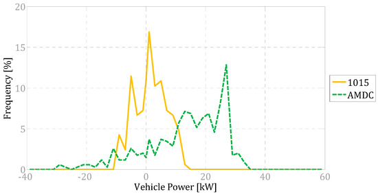 Figure 3 depicts the frequency distribution of the compact vehicle power demand for the two driving missions. The AMDC pattern represents the most extreme case, in which the frequency peak is shifted to the extreme right of the power demand range. The 1015 frequency peak occurs at a very low power demand whereas the whole distribution covers a range of about ±10 kW.