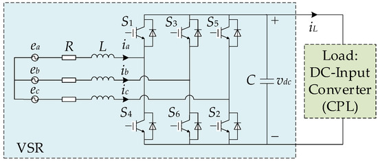 In order to achieve the goal of multi-functionality, low-cost and high reliability, modularization has become an important trend in power electronics [1,2,3]. In the process of modularizing power electronic devices, the situation of converters as loads becomes more and more common, and has attracted wide attention [4,5]. As important interface converters, three-phase voltage-source rectifiers (VSRs) connect the grid to DC-input converters, and are widely used in the fields of electric vehicle charging [6], DC micro-grid [7], more electric aircrafts (MEAs) [8], and photovoltaic generation [9].