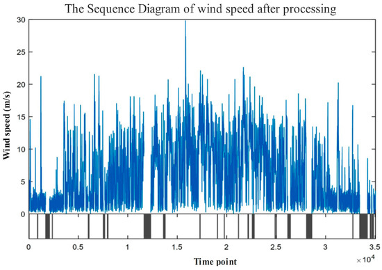Figure 4 shows the wind speed data for empirical research after the removing of outliers and interpolating missing data. Compared with Figure 2a, the effect of the Dynamic Absolute Mean Value method in removing outliers and the practicability of Cubic Spline Interpolation are ensured. From Figure 4, it can be observed that there are only 20 or more values that are empty in processed missing data segments. In the subsequent study, the overall data are decomposed into four datasets for empirical analysis according to the position of these nulls.