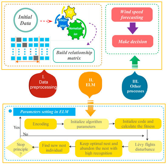 This section proposes building a wind speed forecasting model where random initial input weights and the threshold in the ELM method are optimized by Cuckoo Search. The framework of the entire optimization model is shown in Figure 5. The specific modeling process is as follows: