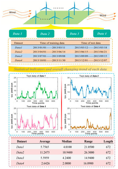 Dangjin Mountain wind farm in Akesai is the first plateau type of demonstration wind farm established in our country and has been in use since 2010. In 2014, the wind farm had an electricity installment capacity of approximately 100 MW and provided surrounding areas with green and clean energy add up to 4.58 billion kWh [37]. The wind speed data collected every 15 min from 1 January to 31 December in 2013 for Akesai Dangjin Mountain wind farm is referenced for empirical analysis data in the experiment.