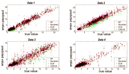 In this section, BP neural net, Mycielski and non-optimized ELM are used as contrast models to analyze the predictable performance of the ELM model optimized by the Cuckoo algorithm proposed in the previous section. To ensure the model’s rationality, node number of input and hidden layers of BP, non-optimized ELM and CS-ELM are set to be the same. Moreover, the function is used as the activation function in three models. The parameter of the model is set as follows: let the nest number , the host recognition , the number of iterations , node number of input and hidden layers . Moreover, function is the activation function, the weight is in [−1, 1], and the threshold is in [0, 1].