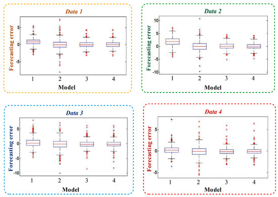To reflect the forecasting effect of each model in different months and seasons, the annual data are divided into four datasets referred to as Data 1, Data 2, Data 3 and Data 4. In the section, at least two months of data are used for training and the weeklong prediction is selected for evaluating the performance of each model. Figure 6 lists the training data and time of the four datasets corresponding to four seasons from top to bottom.