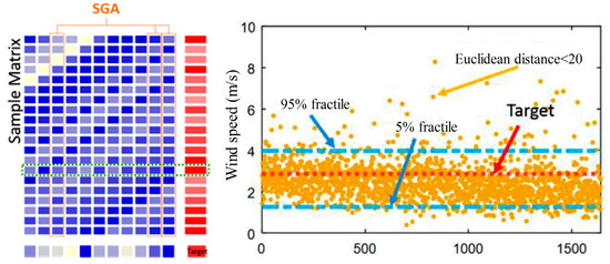 To estimate the probability density function of collected wind speed data, the probability histogram and the Freedman-Diaconis Rule function are applied to calculate . In statistics, the Freedman-Dacoins rule can be used to selected the size of the bins to be used in a histogram [38]. For a set empirical measurements sampled from some probability distribution, the Freedman-Doaconis rule is designed to minimize the difference between the area under the empirical probability distribution and the area under the theoretical probability distribution. According to the Freedman-Diaconis Rules, . The calculation result shows that and that the probability of points falling into the range of 5~30 m is 0.5095. Figure 2c provides the probability histogram after removing missing data.