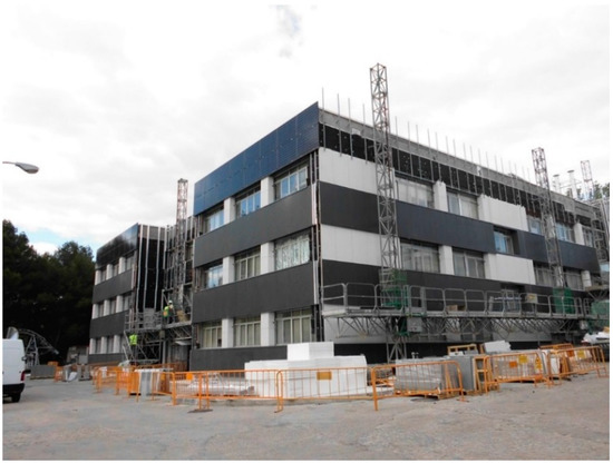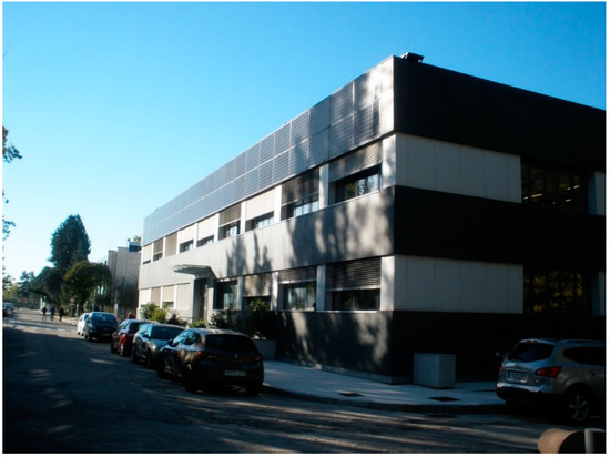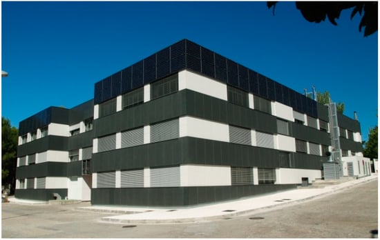 The type of material for the ventilated façade was defined based on these PV modules, looking for similar dimensions and tones, and adapting the modulation and the general appearance such that the integration would be as successful as possible. The combination of the PV modules with the polymer concrete panels selected for the façades achieves a good integration from an aesthetic point of view, thanks to the similarity of colors and shapes (see Figure 1, Figure 2 and Figure 3). The PV modules are integrated into the upper areas of the east, south and west façades, to receive more sun irradiation and occupy a total surface area of about 176 m2.
