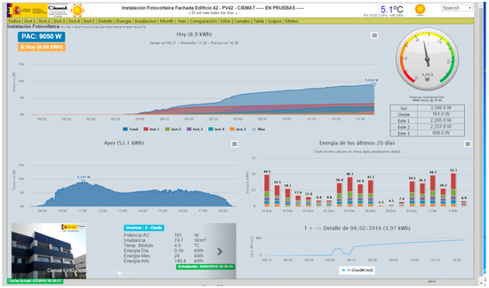 In order to continuously track the operation and quantify the solar photovoltaic energy generated and consumed in the building, the installation is being monitored. This includes the different electrical parameters of each subsystem and the local meteorological variables. The results are displayed as graphs and figures on an interactive screen placed at the entrance of the building (Figure 6).