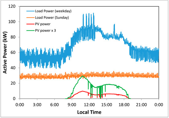 Figure 7 shows the daily consumption profile of the building during a weekday and on a Sunday. Observe that the base load is quite high in this building because part of the load is switched on during unoccupied hours, mainly laboratory equipment that cannot be turned off. Together it is represented the PV generation curve in a clear day of April. Observe the good shape fitting between the weekday curve and the generation profile, due to the distribution of the PV modules among the three different façades. Lowering the building’s load and increasing the number of modules would lead to higher self-sufficiency indexes while keeping 100% self-consumption [34]. Figure 7 includes a hypothetical solution having three times the actual PV installed power, achieving the maximum self-sufficiency and 100% self-consumption (all PV would be consumed in the building even on Sundays).