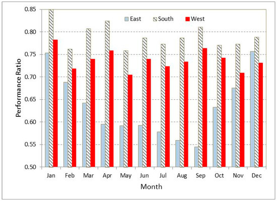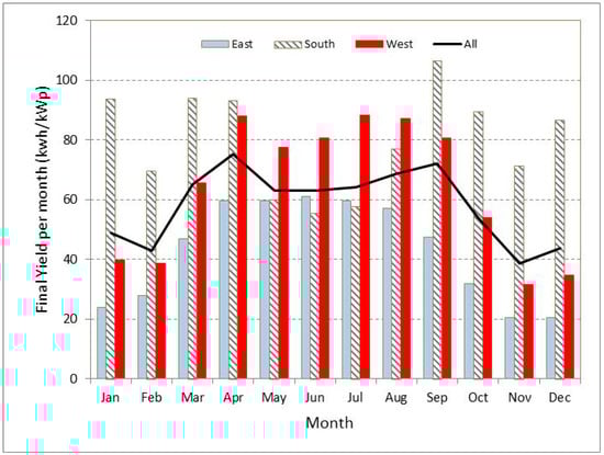 Figure 8 shows the monthly final yield measured along a year at each façade. While the south façade shows the highest productivity during the period from September to April, the west performs the best from May to August. For symmetry reasons, the east façade should have had similar behavior as the west one, or even slightly better because of the lower ambient temperatures during the morning, but the fact is that this façade performs the worst along the whole year. This is clearly seen in Figure 9, which shows the monthly performance factor of each façade along the year.