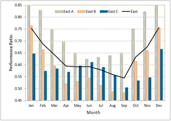 Performance ratio of each of the three equivalent subsystems of the east façade, and average PR value of the whole east façade (line).