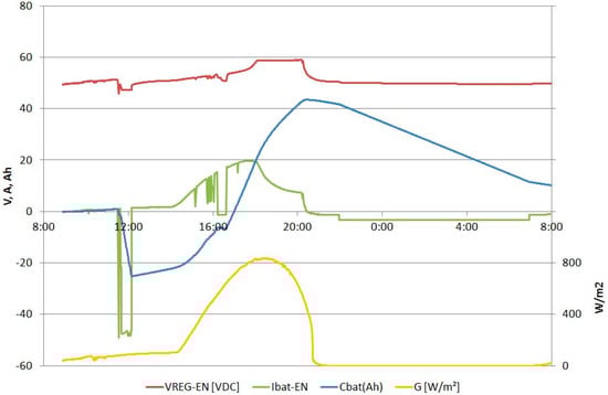 In this building, the stand-alone installation has been designed for testing and educational purposes. Other applications could have been considered instead. Figure 12 shows an example of the performance of sub-system 1 during a clear day (25 April). It can be seen that the west façade starts to receive direct solar radiation at noon, around 14:00 local official summer time. From that moment on, the irradiance G increases continuously up to its maximum at 18:28. The current delivered by the PV modules to the battery, Ibat-EN, follows the irradiance profile till battery reaches its floating voltage, at 18:00. At this point, the charge regulator keeps the battery voltage VREG-EN constant, and the battery current starts to decrease exponentially. Discontinuities in the current waveform are caused by intermittent connections of the load for checking. At night the load is connected between 22:00 and 7:00. During that day, the electric charge or capacity stored in the battery Cbat, after a complete daily cycle, was 10 Ah, the capacity extracted from the battery 54 Ah, and the capacity restored 64 Ah [36].