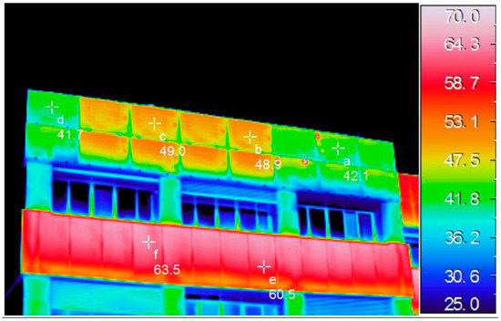 Thermography of part of the west façade, comparing the surface temperatures of the PV modules (upper line) with those of the polymer concrete panels (lower line) [41].