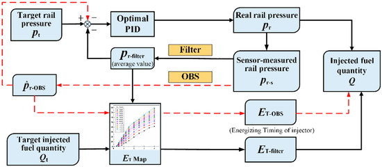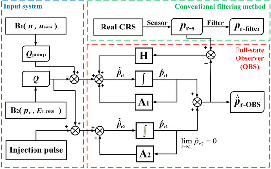 The working principle of the OBS method based on the mathematical model of CRS and conventional filtering method is shown in Figure 2. The conventional control method adopts sensor-measured pressure data after a simple filtering, , as the input parameter of the control system. As mentioned in the previous text, the is an average value over a period of time, and may not accurately represent the real pressure state inside the rail pipe in real time, resulting in cycle-to-cycle variation of fuel injection. Additionally, the sensor-measured pressure, , cannot be directly used as the input of the controller due to the influence of large high-frequency interferential signals, which may cause larger pressure oscillation. Thus, we modified the previous control by adding an OBS model to replace the filter. The OBS method can effectively eliminate the influence of pressure oscillation, resulting from the dynamics of CRS hydraulic components and the wave propagation phenomena after the injection pulse, and decrease the injected fuel quantity oscillation caused by the misjudgment of the rail pressure state. Particularly, the OBS model contains two components, namely, the input system and the full-state observer. The input system includes pumping fuel quantity, , and injected fuel quantity, . is a coefficient associated with speed, , and ; while is a coefficient associated with rail pressure, , and fuel injection duration, . “Injection pulse” represents the action of the injector opening and closing.