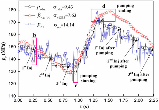 The OBS method aims to modify the previous filter-dependent treatment method so as to reduce the injected quantity cycle-to-cycle variation. Points b, c, and d in Figure 4 are, respectively, the injection start, pumping start, and pumping end times. It is seen in Figure 4 that all three pressures decrease after fuel injection starts (i.e., after point b); after three injection processes, the rail pressure arrives at the minimum value and the fuel pump starts pumping at point c. For this reason, rail pressures increase stably, and after peaking at around the pump ending point d, the pressures slowly decrease. To facilitate the quantitative comparison between and , we calculated the mean square error σ of all three measured pressures, given by where and is approximately equal to the target rail pressure, . Note that has significantly more samples because of the extremely high sampling frequency of the pressure sensor and will not be involved in the following comparison. It is seen that shows the lowest σ while accounts for the largest σ, indicating that the OBS method can be used to substantially reduce the rail pressure oscillation. Overall, and show the same trend as the high-sampling-frequency sensor-measured pressure; however, shows significantly lower pressure oscillation than does, indicating that is more stable and meets the requirement of the control system. More detailed explanations are as follows.