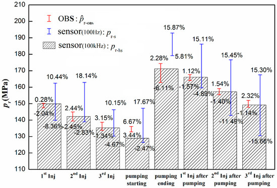 To explain the above observations, Figure 5 shows three measured rail pressures and the comparison of error ranges in each three-injection process before and after pumping. Here, the histogram is the measured under high sampling frequency, which is adopted as a reference of rail pressure. The initial is equal to 150 MPa at the beginning of the first injection and decreases to around 144 MPa when the second injection begins, finally degenerating to less than 138 MPa before the third injection because of the fuel mass decreasing in the rail pipe. Due to the over-attenuation of the rail pressure, the fuel pump starts to work to maintain the rail pressure, followed by another three injections in the next pumping–injection cycle. The rail pressure after pumping is slightly higher than the initial pressure (i.e., 150 MPa) because of the fuel metering valve closing delay in the fuel pump. As expected, shows significantly narrow error bars, indicating that the OBS method results in less pressure oscillation. It is interesting to observe that is always higher than at pumping start times; however, is always higher than p at pumping end times, indicating that the OBS method shows better response characteristics. This can be understood by recognizing that the OBS method which employs the mathematical model and gain matrix (shown in Figure 2) shows a substantial compensation effect on the valve delay, hence earlier pressure rises.