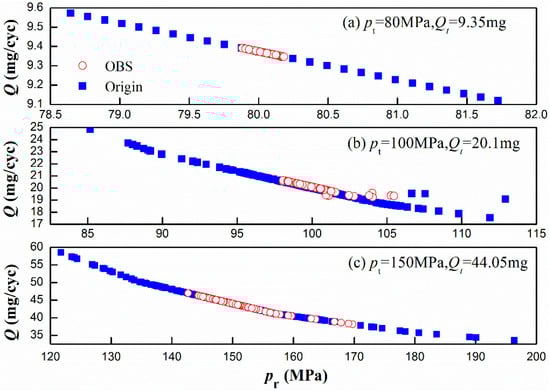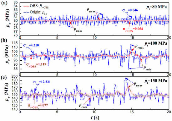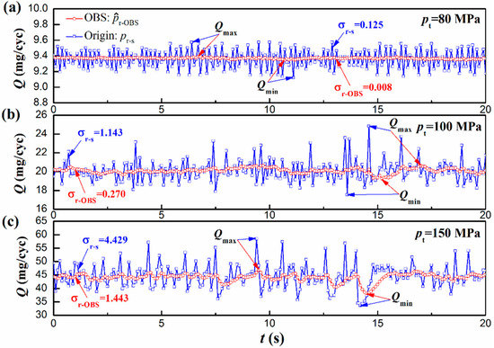 As discussed in the Introduction, rail pressure oscillation results in the cycle-to-cycle variation of injected fuel quantity in the OPCI engine. To further investigate the difference between conventional filtering and the present OBS method, we extended the comparison from pressure oscillation in one pumping–injection cycle to the rail pressure and injected quantity cycle-to-cycle variation. Figure 6 shows the comparison between and under three different target pressures (i.e., 80 MPa, 100 MPa, and 150 MPa), corresponding to small, medium, and full engine operating load, respectively. Rail pressures of the first injection in 200 continuous pumping–injection cycles were collected and illustrated.