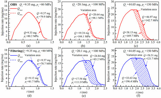 To show the influence of rail pressure oscillation on the injection rate of the OPCI engine, Figure 9 illustrates the measured injection rate for the maximum injection quantity cycle, , and minimum injection quantity cycle, , of the full engine load in the collected 200 cycles for three different operating conditions corresponding to the injection quantity in Figure 7. The real rail pressure and injected quantity are also indicated in each graph. Specifically, Figure 9a–c show the case of OBS methods while Figure 9d–f show the case of the conventional filtering method.