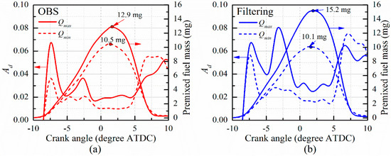 To quantify the evaporation and mixing processes, we defined a time-dependent ratio , where and are the initial parcel number and Sauter mean diameter (SMD), as an index of total droplet surface area. Figure 10 shows the evaluation of (on the left Y axis) and premixed fuel mass (on the right Y axis) of different treatment methods. The prediction of for is higher than that of , which can be seen in both of the two methods. The larger indicates a higher total fuel droplet surface area, resulting in high evaporation rate and premixed fuel mass according to the well-known law [30]. As expected, due to the smaller cycle-to-cycle variation in the fuel injection rate, the OBS method predicts a significantly smaller discrepancy between the two extreme cycles in premixed fuel mass than the conventional filtering method does. The maximum premixed fuel mass of for the OBS method is 12.9 mg—22.9% higher than that of . In terms of the conventional filtering method, the maximum premixed fuel mass of is 15.2 mg—50% higher than that of .