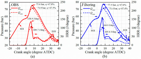 Comparison of the predicted cylinder pressure (on the left Y axis) and heat release rate (HRR, on the right Y axis) between and in 200 cycles for (a) the OBS method and (b) the filtering method. , . SOI denotes the start of injection while EOI denotes the end of the injection. is the indicating thermal efficiency.