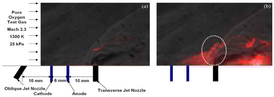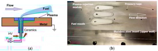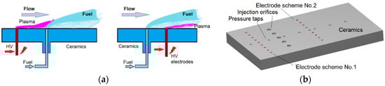 In the first test [87,88,89], a nanosecond pulsed plasma discharge located between two fuel jets was used to ignite and hold jet flames in supersonic crossflows, with a cavity or without the use of mechanical elements (cavity or wall step) for flame holding. In the configuration without the cavity, the fuel injection nozzles and discharge electrodes were mounted flush with the surface of the flat wall adjacent to the freestream flow. The non-equilibrium plasma was produced by repetitive pulses of 15 kV peak voltage, 10 ns pulse width, and 50 kHz repetition rate. Sonic or subsonic fuel jets (hydrogen and ethylene) were injected into an oxygen freestream of Mach numbers M = 1.7–2.4 and static temperature T0 = 900–1300 K, as it is shown in Figure 6a. Note, the plasma was generated “in-situ”; and the average plasma power was extremely low, down to Wpl = 10 W.