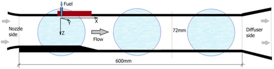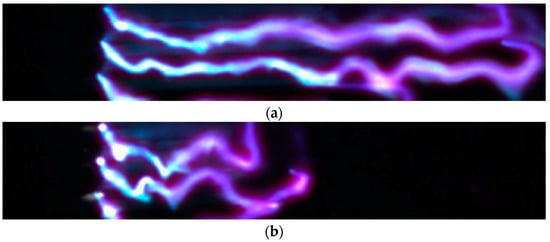 In this test series, two schemes were examined for the injectors and plasma generator arrangement, as shown in Figure 8. In scheme 1, electrodes are located upstream of the fuel injectors; plasma is generated mostly in air and then interacts with the injected fuel [16]. In scheme 2, electrodes are located downstream of the fuel injectors; the electrical discharge is generated in non-uniform air-fuel composition [101]. The fuel is injected through 5 circular (d = 3.5 mm) orifices all in a row across the span, as shown in Figure 8b. The row of injectors is located 20 mm downstream of the first row of electrodes and 30 mm upstream of the second row of electrodes. The duration of the discharge was approximately 100 ms. The fuel injection was initiated 20 ms after the electric discharge. Typically, the fuel injection was continued 20 ms after the discharge to observe the pattern of flame extinction. The power supply used in these experiments was designed to work with a steeply falling characteristic and individual control of electric current through each electrode [91] by varying the internal resistance in every output circuit of the power supply. In the described configuration, the power supply operates in a current stabilized mode. The discharge power was measured in a range of Wpl = 6–24 kW. The magnitudes of the discharge voltage and current were oscillating within a range of Upl = 0.7–2 kV and Ipl = 2–7 A because of plasma filaments length variation. After fuel injection initiation, the plasma filaments behavior changed significantly, showing an increase of plasma emission intensity and movement of the plasma filaments away from the surface. The detailed data for the discharge dynamics and parameters were presented in Refs. [16,69,101].