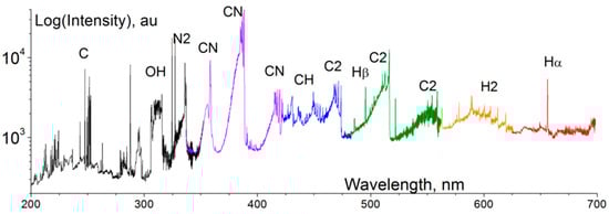 Composite optical emission spectrum obtained from the ethylene-airflow-plasma interaction region. Major emission lines and bands are labeled. Reprinted from [28] with permission from Elsevier.