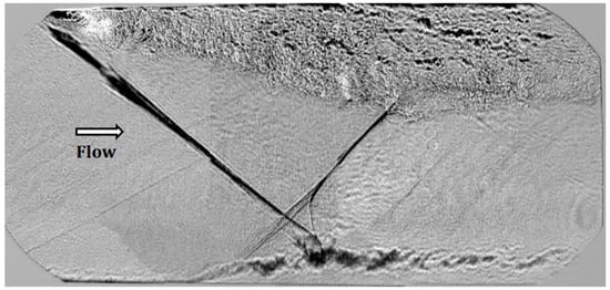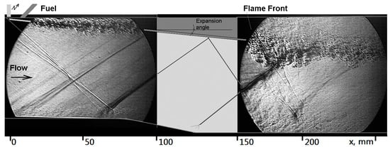 A typical schlieren image for scheme 1 is shown in Figure 11, illustrating the flow structure during plasma-assisted combustion. In this case, the zone of intensive thermal power release (flame front) is observed downstream of the fuel injection port and the electrodes. An obvious feature of this pattern is that the combustion is stabilized due to the pressure increase where the shock wave impinges the post-plasma/fuel shear layer at x = 160–180 mm. It has to be compared to Figure 10a, data on pressure distribution for the scheme 1, ṁC2H4 = 1.3 g/s, where a significant increase of the wall pressure is observed at same location. A similar effect is considered for the scheme employing plasma generation along the fuel jet (see below).