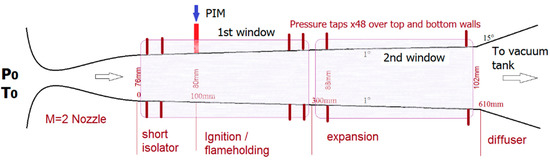 The experiments were performed in the supersonic blow-down wind tunnel SBR-50 at the University of Notre Dame. The test section dimensions are similar to ones described for previous tests while the flow parameters have a wider range than in PWT-50H. The combustor cross section at the exit of the nozzle is Y × Z = 76.2 mm (width) × 76.2 mm (height), with a 1° expansion half-angle and a total length of x = 610 mm measured to the diffuser, as it is shown in Figure 12. The fuel injectors and electrical discharge generators are flush-mounted on a plane wall as a single unit, indicated in Figure 12 as “PIM”—Plasma-Injection Module. The test section of the SBR-50 high-speed combustion facility is equipped with two pairs of quartz windows placed as the side walls of the duct for optical access. Ohmic heating is used to bring the air in the plenum chamber up to T0 = 750 K, providing a non-vitiated oxidizer for the combustion chamber. In the current experimental series, the conditions were as follows: initial Mach number M = 2; total pressure P0 = 1–2.2 bar; stagnation temperature T0 = 300–750 K, air mass flow rate ṁair = 0.5–2 kg/s; duration of steady-state aerodynamic operation t = 1–2 s. Instrumentation available for this test includes: wall pressure taps; fast camera imaging Photron FastCam (b/w) and Casio EX-FH100 Camera (color); high-definition schlieren system, details are described in [31]; optical emission spectroscopy (OES) based on OceanOptics spectrometers; set of electrical probes.