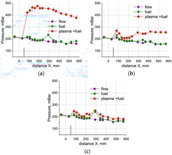 Figure 10 presents typical data for the wall pressure distribution in the case of schemes 1 and 2: normalized wall pressure P/Pst0 during plasma-assisted combustion; Pst0 is static pressure at x = −80 mm; total discharge power was Wpl = 9–12 kW. The discharge working without fuel injection affects the pressure distribution a little, increasing the pressure in the vicinity of the electrode system. When the fuel injection is turned on, the pressure rises slightly in the zone close to the injector for scheme 1 and close to the plasma area for scheme 2. This pressure gain is associated with the fuel partial oxidation by atomic oxygen O. Other reaction branches are related to electronically/vibrationally excited nitrogen (N2*) and active species generated by the plasma. In scheme 2, highly reactive species and radicals, such as H, CH, and C2H3, are involved in the initial fast chemical processes [3,5]. The products of these plasma-chemical reactions are accumulated in the associated separation bubble. Major chemical energy release takes place after fuel mixing with the core flow in the second combustion stage [2], rather than downstream from the place of plasma generation. Figure 10 demonstrates this zone, which was located at x > 120 mm. The schlieren image in Figure 11a depicts this zone as well; it is labeled as the “Flame front”. If the plasma power is low enough, i.e., Wpl < 8 kW, the second combustion stage may not be observed. Two effects are responsible for this: the first one is insufficient fuel activation by the discharge, and the second one is insufficient fuel-air mixing. Numerical modeling [15], including mixing processes and plasma-chemical kinetics, demonstrates that the second effect may be dominant.