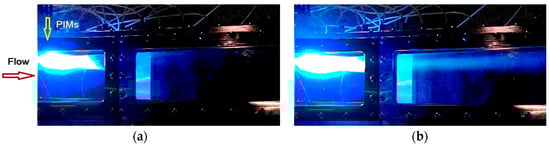 An overall view of the combustion zone is also different for the strong and weak combustion cases, as it is shown in Figure 15. The PIMs are located at the beginning of the test section as indicated in the image by an arrow. With strong combustion, a zone of bright luminescence concentrates close to the PIMs, whereas with weak combustion and partial oxidation there appears a long tail of luminosity in a zone far from the PIMs. Analysis of such images was performed in [108]. For realization of strong combustion mode, the plasma power should be sufficiently high, in a range of Wpl = 10–20 kW for M = 2, P0 = 1.7 bar, T0 = 300 K, and ṁC2H4 = 2–8 g/s. Increasing the pressure, fuel mass flow rate, or flow velocity requires higher plasma power. For hydrogen combustion the power threshold is significantly lower.