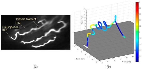 Discharge dynamics and appearance depending on the fuel mass flow rate were explored by means of high-speed imaging. In [28], it was shown that the discharge follows the shear layer of the injected fuel jet under some conditions, namely if the gas velocity is higher than the ion drift velocity. A kinetic mechanism of the discharge specific localization was unveiled in [77]. A higher mass flow rate of the fuel injection leads to an increase in the effective length of the plasma filaments and thus increases the time of interaction between a single plasma filament and the flow with an appropriate portion of the fuel. At higher mass flow rate the discharge appears to have a sophisticated shape, somehow reflecting a shear layer structure, as is shown in Figure 16. The plasma filaments achieve lengths of 100 mm and longer, and the shape of the plasma filaments follows vortex structures in a mixing layer during fuel injection. The cathode spots move along the metallic wall until a new breakdown occurs at a position closer to the PIM. With strong combustion the plasma filaments are shortened due to flow separation. A 3D reconstruction technique was used to discover the plasma filament shape, rotating direction, and location vs. fuel concentration map [110]. An example of the plasma morphology for a single filament is shown in Figure 16b, where color of the plasma filament was assigned to the relative curl of the position of the filament with clockwise rotation represented with the positive half of the scale. In the first x = 15 mm downstream of the injection port, in the YZ plane, the plasma filament locates around the position of fuel-to-air = 1:1 but shifted closer to equivalence ratio ER = 1 line in the downstream zone, x > 60 mm.