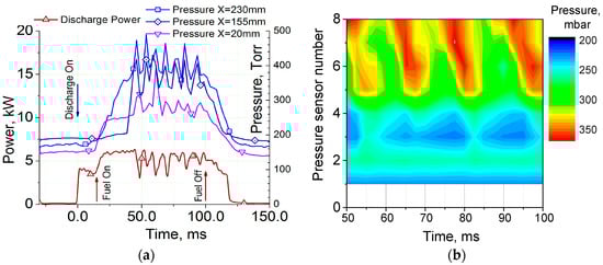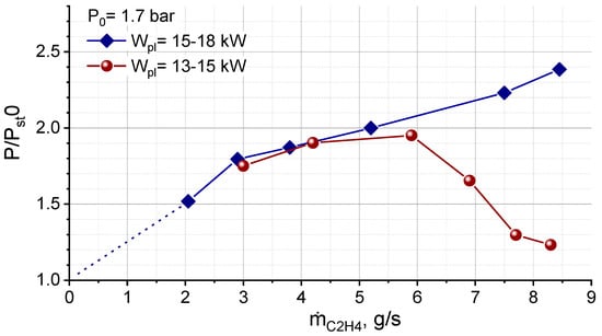 The data on the wall pressure for plasma-assisted combustion are shown in Figure 18 for two different power values of the electric discharge. It was found that, at P0 = 1–2 bar, the increase of fuel flux leads first to wall pressure rises up to ∆Pst/Pst = 1–1.5 at ṁC2H4 < 4–6 g/s, then to pressure stabilization, and then to a significant decrease of pressure effect due to development of combustion instability.