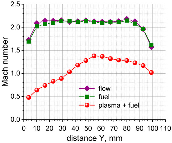 Mach number distribution over the test section of SBR-50 at plasma-assisted combustion: P0 = 1.8 bar, T0 = 290 K, ṁC2H4 = 5.4 g/s, Wpl = 13.6 kW.