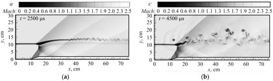 In papers [124,125], the study was performed on the effect of a pulsed periodic energy deposition on the mixing of supersonic flow with collocated supersonic jets that interact with an oblique shock. Numerical results show that the mixing in the two-dimensional flow with a planar jet is intensified and the subsonic zone is suppressed. “It happens because of (1) the Richtmyer–Meshkov instability generated by the heated zone interacting with bubble shock has the suction effect on the jet and conjugates with the vortex of the upper shear layer; and (2) the misalignment of gradients of density and pressure affects the generation of baroclinic vorticity in the shear layers. For the low-density jet, the baroclinic term increases the vorticity, while the trend is opposite for the high-density one”. Additionally, this study demonstrates the feasibility of significant intensification of the process of mixing of supersonic and subsonic jets with an ambient concurrent supersonic flow using a localized pulse periodic energy supply under conditions of their interaction with an oblique shock. Figure 20 shows the result of simulations demonstrating a significant intensification of the mixing with help of a pulsing energy source in supersonic M = 2 flow [124].