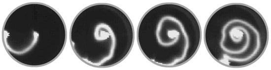 A magnetohydrodynamic (MHD) method was proposed for mixing promotion in the group headed by Bityurin [122,123,135,136]. The approach consists of creating a short pulsed electrical discharge in the gas flow and in using the interaction of electrical discharge with an external magnetic field for initiation of the secondary vortex flows. In the axisymmetric configuration (flow through a tube and axial anode), a quite sophisticated pattern of the discharge morphology and dynamics was observed, as it is shown in Figure 22. The behavior and peculiarities of evolution and dynamics of electrical discharge in gas medium/flows under an external magnetic field, such as discharge evolving in the form of an untwisting spiral around the central electrode, its rotation in a circular gap, and discharge localization near the contact surface at the two stream boundary, indicate the possibility of application of the MHD method for mixing intensification [136].