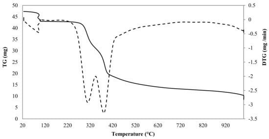 Mass loss and rate of mass loss profiles for CNS. The solid line corresponds to the thermogravimetric (TG) curve and the dashed line represents the derivative of the curve (DTG).