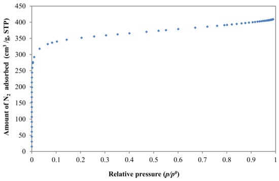 According to the International Union of Pure and Applied Chemistry (IUPAC ) classification, the N2 adsorption isotherm is of type I; this indicates that the produced activated carbon is strictly microporous. As can be noted from Figure 2, the nitrogen uptake is high at low relative pressure (p/p0 < 0.1) and can be explained by micropores filling. As expected, the use of CO2 as activating agent in a single step physical activation method mainly develops microporosity in biomass activated carbons [41].
