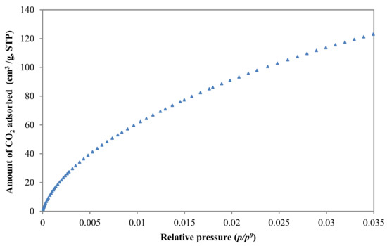 CO2 adsorption in Figure 3 assesses the narrower microporosity (<1 nm). A wide narrow micropore size distribution characterizes the shape of the CO2 isotherm.