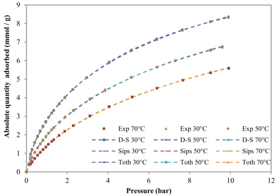 The experimental adsorption isotherm data collected at 30, 50 and 70 °C were fit to three different models to account for the equilibrium of adsorption, namely Sips, Toth and Dual-Site Langmuir (D-S), (Equations (2)–(8)).