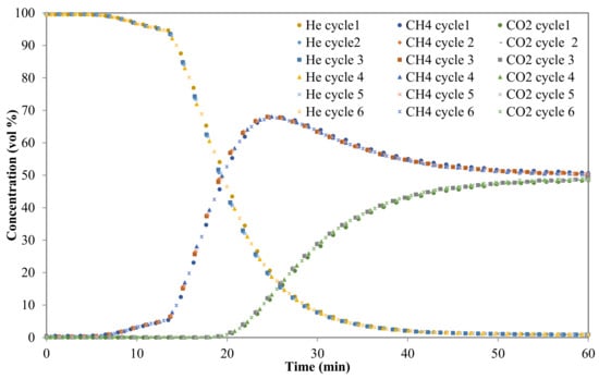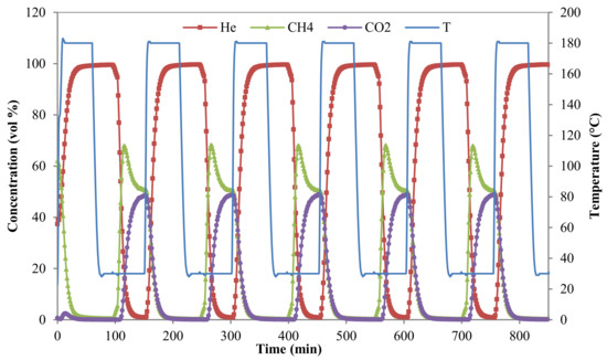 Figure 7 shows an example of six-consecutive adsorption and desorption experiments for an equimolar CO2/CH4 gas mixture fed to the adsorption fixed-bed at 1 bar. It was used as carrier gas during the preconditioning and regeneration steps. It is observed that during the initial period preceding the saturation of the bed, both components in the feed gas, CO2 and CH4, are completely adsorbed on the CNS activated carbon bed. Then, as expected according to the data from the adsorption isotherms (see Figure 4 and Figure 5), CH4 breaks through first.
