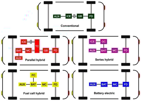 Simplified layouts of different city bus powertrain configurations (AUX = auxiliary devices, BAT = battery, FC = fuel cell, FD = final drive, GB = gearbox, GC = generator and controller, MC = motor and controller, TC = torque coupler).