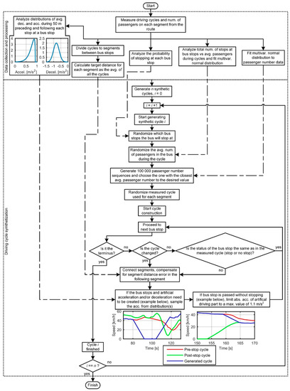 In order to acquire a large quantity of varying driving cycles for a single bus route, a driving cycle synthetization method was used. In the synthesis process, which is described in the flowchart in Figure 2, new driving cycles are generated for a selected bus route in a segment-based cut-and-paste process that uses actual measured driving cycles from the route as its basis. In this process, a segment is considered to be the driving profile between two consecutive bus stops. In the synthetic cycles, the measured cycle used for each segment is randomized, and only the respective segments can be chosen (e.g., for the third segment in the synthetic cycle, only the third segments in the measured cycles can be chosen). The bus stops at which the vehicle will stop at during the cycle are randomized, as are the passenger numbers, with both being based on the probabilities found in the measured cycles. The mass of a passenger was defined as 68 kg in this study as per Federal Transit Administration (FTA) bus testing regulations [24].