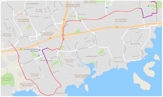 Espoo bus line 11, purple sections indicate areas with high density urban dwellings. (Map data ©2018 Google).