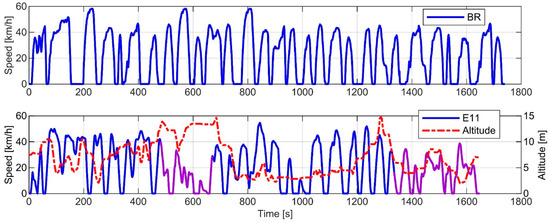 Figure 4 features an example driving cycle from the E11 route, as well as the BR cycle. The altitude profile of the E11 route is included in the figure. The purple lines in Figure 3 and Figure 4 indicate the areas of the route with high density urban dwellings. These areas tend to feature higher traffic. The altitude of the terminus is 0.5 m lower than that of the starting point. At its highest point, the route is 14.7 m above sea level, and at the lowest point, it is 2.0 m above sea level. The steepest positive road inclination angle (uphill) on the route is approximately 4.0 degrees and the steepest negative angle (downhill) is approximately −3.6 degrees. The average uphill angle is 0.4 degrees and average downhill angle −0.5 degrees.