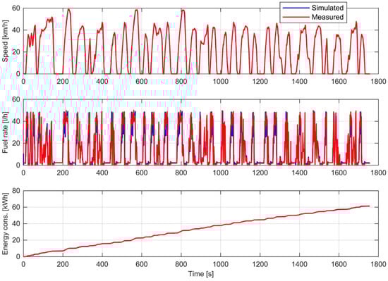 As measurement data was available from a battery electric bus and a diesel bus, the respective simulation models were modified to match the buses. The modified models were validated by comparing simulated and measured quantities. Diesel bus dynamometer data was acquired from VTT Technical Research Centre of Finland. The laboratory has up-to-date calibrated chassis dynamometer and measurement procedures. The measurement procedures have been accredited. The dynamometer test simulated the Braunschweig cycle. The sampling rate of the measurements was 10 Hz. In the test, the bus had a payload of 4750 kg. The curb weight of the bus is 14,750 kg. Hence, the total mass was 19,500 kg, and the mass of the simulation model was set to the same value for the validation. The energy consumption was calculated based on fuel flow data with the density of diesel fuel assumed to be 0.835 kg/L and the heating value 42.5 MJ/kg as per the default values provided by Autonomie. A comparison of the fuel rate and of the cumulative energy consumption between the measured cycle and the simulated cycle is presented in Figure 7. The root-mean-square error (RMSE) of the simulated fuel rate was 5.06 L/h. The simulated energy consumption was 61.26 kWh, and the measured consumption was 61.44 kWh, meaning that the error was 0.3%. The average ambient temperature during the measurements was 23.0 °C.