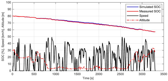 The powertrain of the battery electric bus simulation model was modified to match the one in the actual bus, and the model was validated. The opportunity-charging type BEB features a lightweight aluminum chassis, and its curb weight is 10,500 kg [36]. Figure 9 shows the state-of-charge (SOC) of the battery pack during the measured and simulated cycle, as well as the speed and altitude. The SOC was estimated using Coulomb counting in both the actual bus and the simulation model. The total SOC change during the measured cycle was 23.04%, and during the simulated cycle, it was 23.02%. The RMSE of the simulated SOC was 0.52%. It can be seen in Figure 9 that the simulated SOC deviates slightly from the measured value during the first half of the cycle up to a maximum difference of 1.20%, and then during the second half, the simulated and measured values converge again. This was presumed to be a result of inaccuracy in the altitude profile, as the cycle featured the full route of the Helsinki 55 bus line.