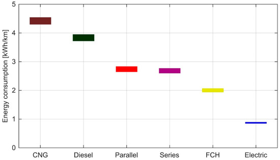 The results demonstrate the significant energy consumption reductions that hybrid powertrains can yield compared with conventional powertrains. Even the hybrid bus that had the highest consumption, the parallel hybrid, consumed 30% less energy on average than the diesel bus. The series hybrid consumed approximately 5% less energy on average than the parallel hybrid. However, the CV of the consumption was slightly lower with the parallel hybrid than with the series hybrid. The BEB had the lowest energy consumption by a large margin; even the FCH consumed 130% more energy on average. Furthermore, the BEB had the lowest statistical dispersion of the consumption, which demonstrates that the battery electric powertrain is the most resistant of the six compared powertrains to variations in the driving cycle on a typical suburban driving route. The lower variation compared with the hybrid powertrains is mostly due to the battery electric powertrain lacking the kind of relatively inefficient component (i.e., ICE, engine-generator, or fuel cell) that the hybrid powertrains need to deploy to a varying extent depending on the driving cycle.