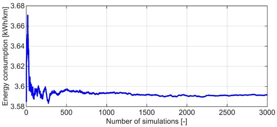 As can be seen in Figure 11, there was significant variation in the average consumption during the first 500 cycles. During the final 500 cycles, the value only varied between 3.5920 and 3.5905 kWh/km. Hence, it can be stated that 3000 cycles produce statistically reliable results.