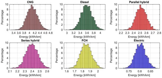 The energy consumption histograms of the 3000 synthetic E11 cycles are presented in Figure 12 and the distribution statistics in Table 8. The coefficient of variation (CV), which describes the statistical dispersion of the data, is calculated by dividing the standard deviation with the mean.